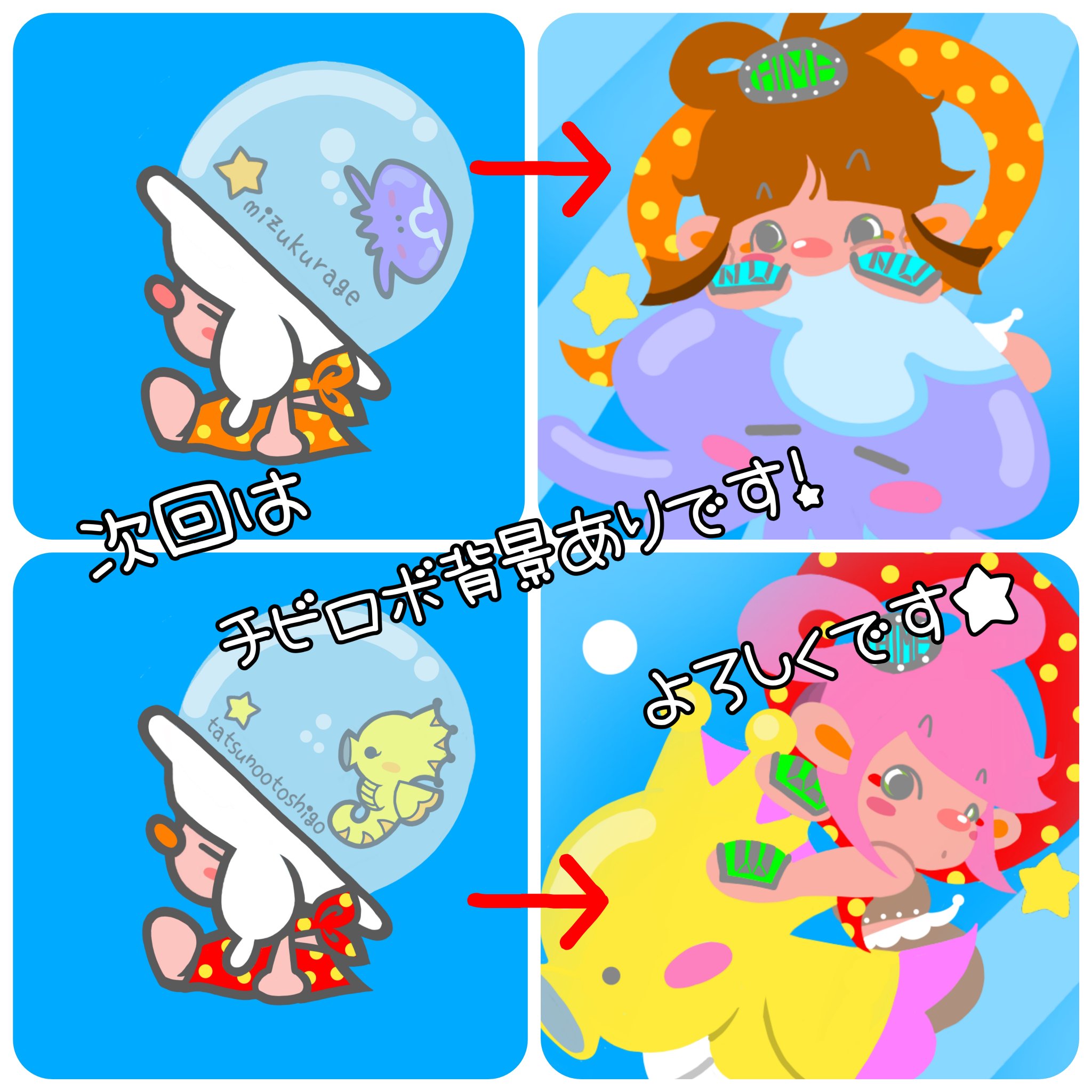 🌊双子乙姫SISTERS🌊 UMIEちゃんとUMINOちゃん、チビロボ背景ありで実写化してみた😆❤️ なかなかかわゆいと思います✨ 海感もいい感じに描けた‼️ #HEXANFT