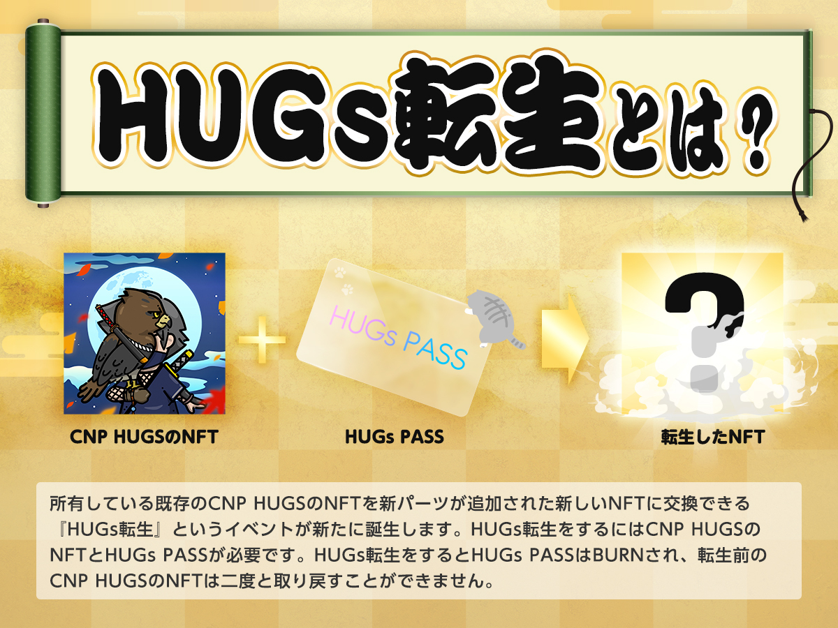 HUGs 転生とは❓ 今後リリースする「HUGs PASS」を使い、既に持っているCNP HUGSを、新たなパートナーやコスプレ、背景など様々なパーツが追加されたCNP