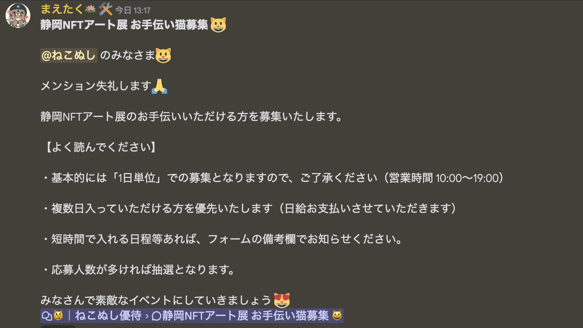 ใ€ใŠๆ‰‹ไผใ„ๅ‹Ÿ้›†ใ€‘ ใญใ“ใฌใ—้™ๅฎšใง้™ๅฒกNFTใ‚ขใƒผใƒˆๅฑ•ใฎใŠๆ‰‹ไผใ„ใ„ใŸใ ใ‘ใ‚‹ๆ–นใ‚’ๅ‹Ÿ้›†ใ„ใŸใ—ใพใ™๐Ÿ˜บ ๅ‹Ÿ้›†ใŠๆ‰‹ไผใ„ใ„ใŸใ ใ‘ใ‚‹ๆ–นใฏใ€ๆณจๆ„ไบ‹้ …ใ‚’ใŠ่ชญใฟใ„ใŸใ ใใ€็”ณ่ซ‹ใƒ•ใ‚ฉใƒผใƒ ใ‚’่จ˜ๅ…ฅใ—ใฆใใ ใ•ใ„๐Ÿ™ ใ€Œ๐Ÿ˜ผ๏ฝœใญใ“ใฌใ—ๅ„ชๅพ…ใ€ใƒใƒฃใƒณใƒใƒซใ‹ใ‚‰ใฉใ†ใž๏ผ #LLAC