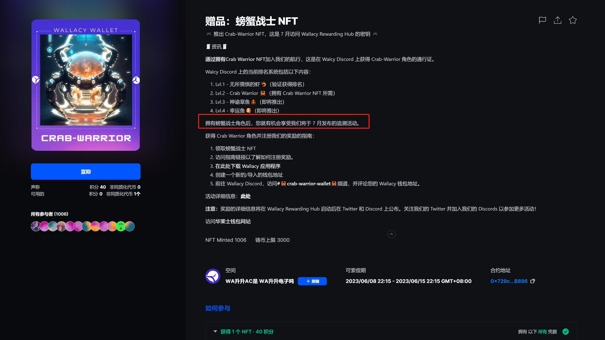 Crab-Warrior NFT限量还剩2000,7月有追溯空投 1)完成银河任务:https://t
