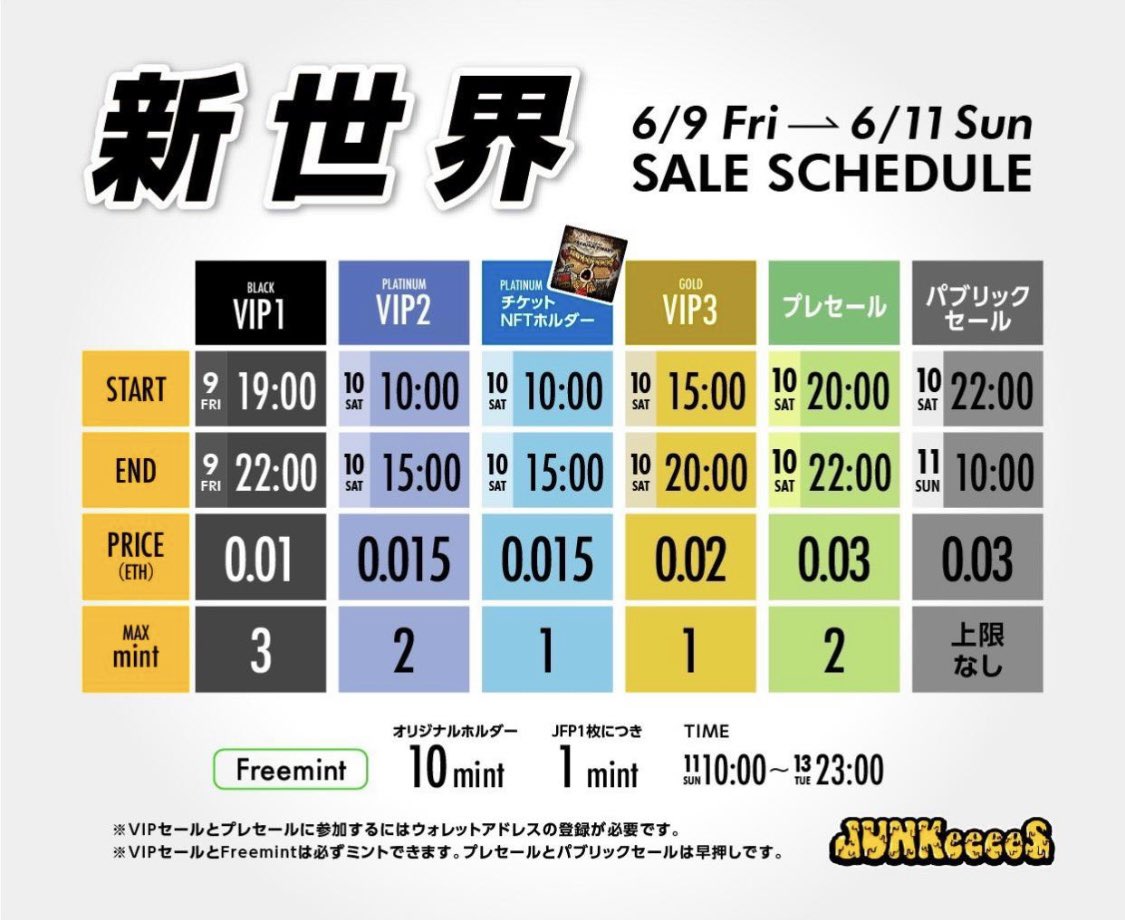 今日は経験値を多く貯めた vip①の方のミントでした 明日は10:00より vip②の方のセールが開始されます‼️ 同じくチケットNFTホルダーの 方も明日10:00より セールに参加できますので お楽しみに‼️ まだまだ激アツな素体やコラボが でてきてないので、 楽しみですね🤭 #JUNKeeeeS #ジャンキーズ