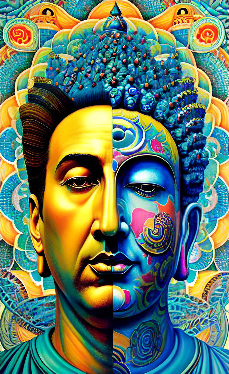 Nicolas Cage buddha transformation. Became a buddha