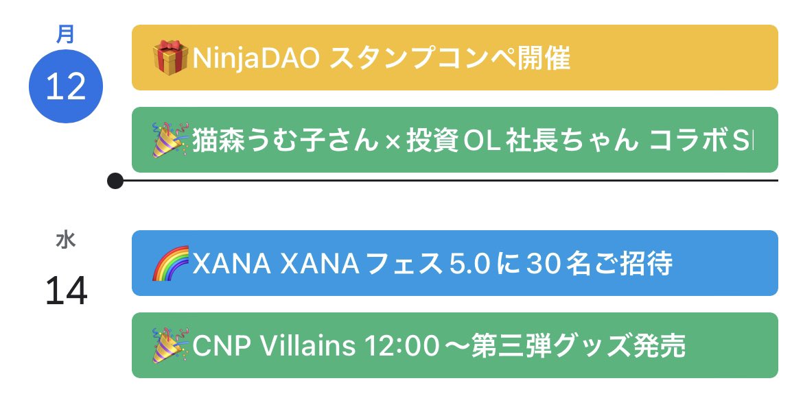 6/12 今日知っておきたいNFTニュース 🌟今日は2PJ🌟 ・NinjaDAO ・猫森うむ子さん×投資OL社長ちゃんさん 明日はイベントなし⁉️ 火曜日も2つだけ⁉️ と思われるかもしれませんが 発表されたイベント情報は 随時カレンダーに更新しています😊 今日発表された内容は 翌日午前中には更新しているので…