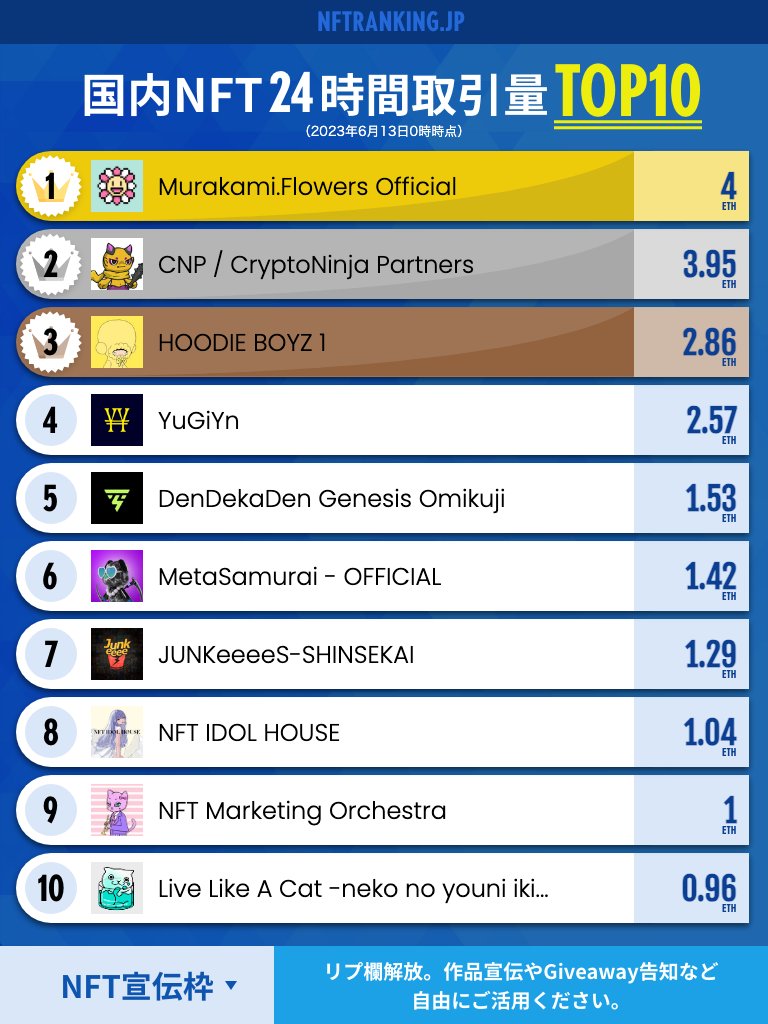gm☀️国内NFTランキングを更新しました(11位以下はサイトをご確認ください) ✅リプ欄は作品宣伝やGiveawayの告知など自由にご活用ください。