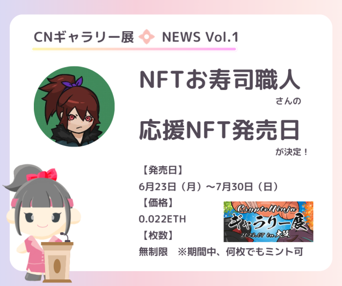 \6月14日ギャラリー展News/ ✅NFTお寿司職人さんの描きおろしイラストによる応援NFTの詳細決定! ✅超VIPクリエイターによる1点限定キャンバスプリント付きNFTの発売スケジュール決定! ✅ファンアートコンペ受賞作品キャンバスプリントは7月14日より発売予定!…
