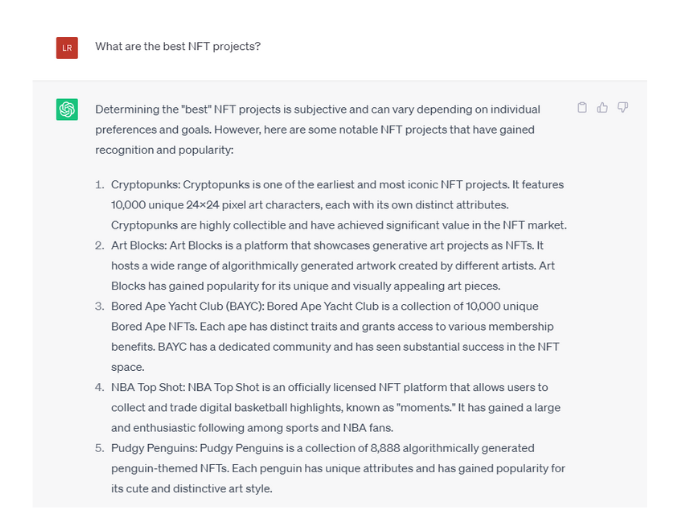 The best NFT Projects according to ChatGPT https://t