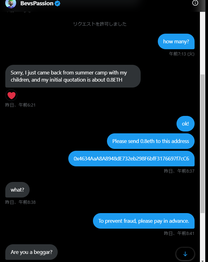 NFT界隈でDMでのoffer依頼詐欺が流行ってますが、自分にも来たので一応共有👍 先払いしてって話したら乞食って言われました😂 どう考えてもこっちのデメリットしかないから先払いじゃないと無理だろ~~~~
