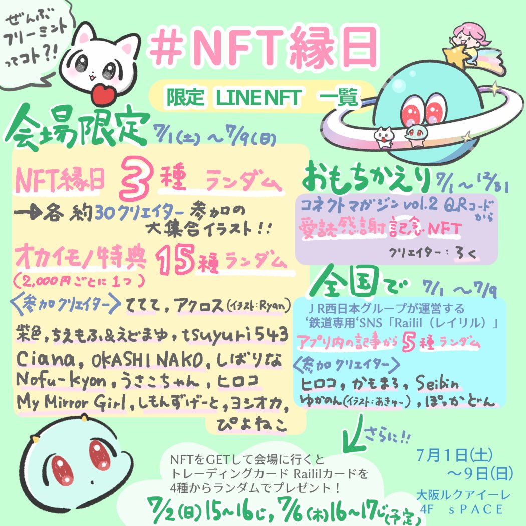 フリーミントでもらえる #LINENFT は 最大24種類!!😳🍀 (家族やおともだちと協力すれば可能😂) ↓会場限定3種のNFTは、会場設置のQRコードからGETできます🏮