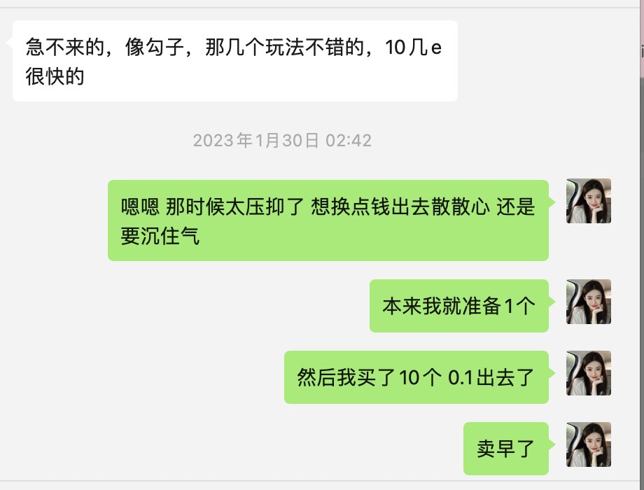 我今年初压力很大,然后把freemint 10张Checks - VV NFT 单张0.1e,全部卖掉去桂林阳朔玩。 后面涨到了1e+。少赚了15ku。 但是也没啥好后悔的,即使赚到了这笔钱也不会改变我当下的生活。只是数字。而且自己认知不够也拿不住。 所以这半年每次卖飞我都安慰自己,没有那个命,赚到了也不会怎么样。