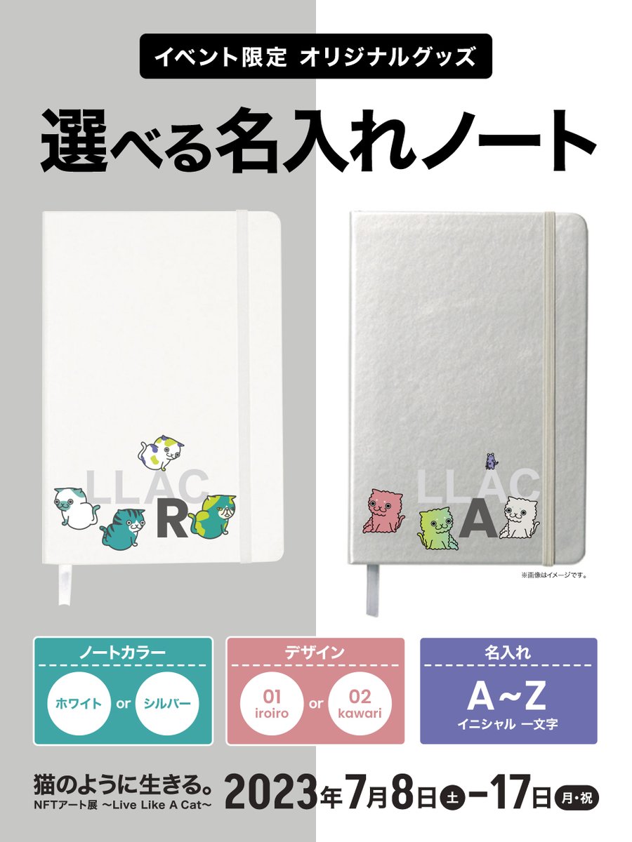😺イベント限定ノートを予約しよう😸 LLAC静岡NFTアート展来場予約時にイベント限定グッズ「選べるイニシャルノート」をご予約いただけます⚡️ 明日6/23(金)18時から静岡新聞新聞SBSのアットエスにて事前予約の受付LINEのURLをご案内します。