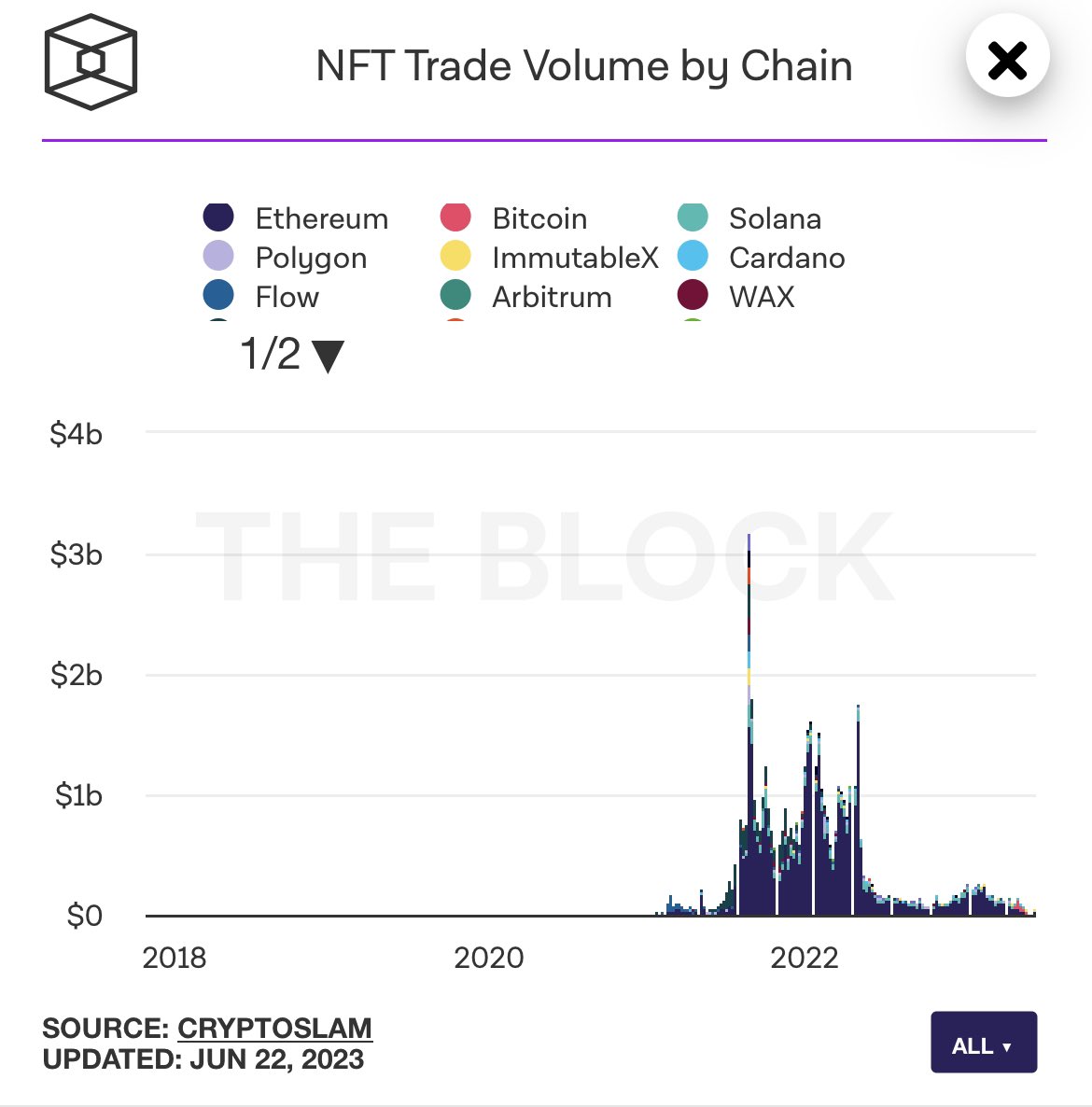 NFT Trade Volume by Chain: 1) All time view 2) This