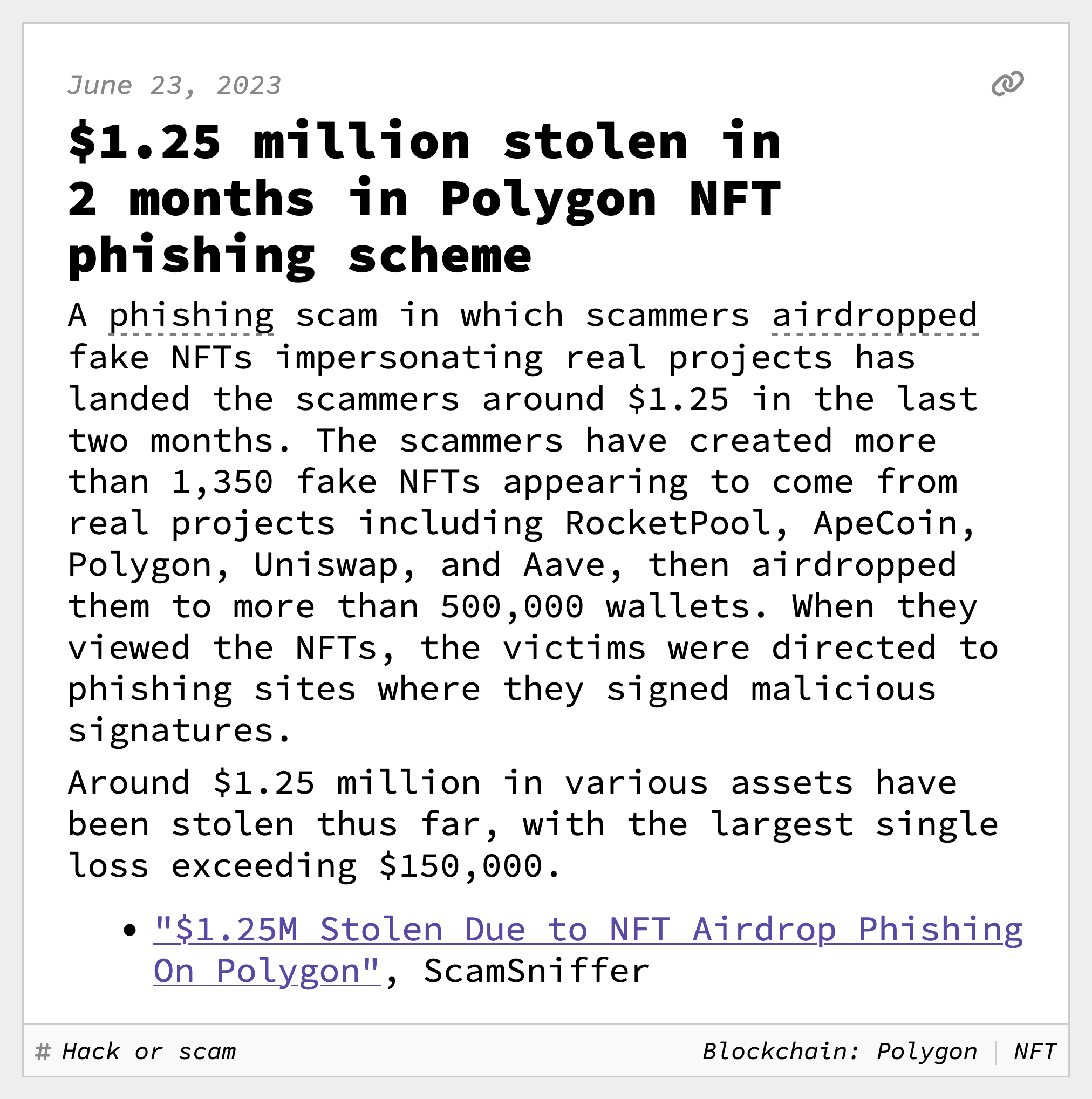 $1.25 million stolen in 2 months in Polygon NFT phishing