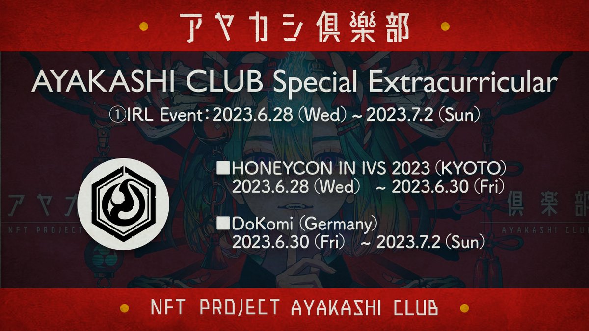 Special Extracurricular:①IRL Event アヤカシ倶楽部&秋赤音氏が2つのIRLイベントへ出展。 両会場にて1/1オリジナルNFT特別ステッカーを配布。 DoKomiでは秋赤音氏による50分間のライブドローイングとDoKomi限定グッズの販売を行います。