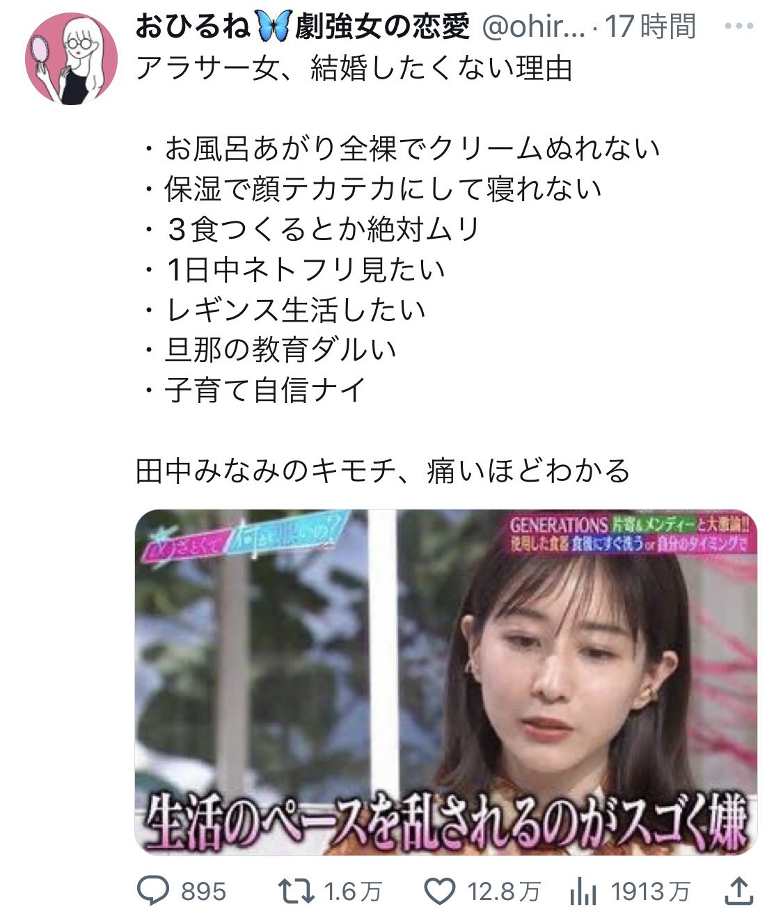 アラサー女、結婚したくない理由 ・NFTやってると言えない ・ラジオやってると言えない ・投資してるの言えない ・Twitterアカバレたくない ・1円にもならない活動してると言えない ・オフ会も行きづらい ・子育てしてる場合じゃない 自分のことでいっぱいいっぱいでムリ🥹