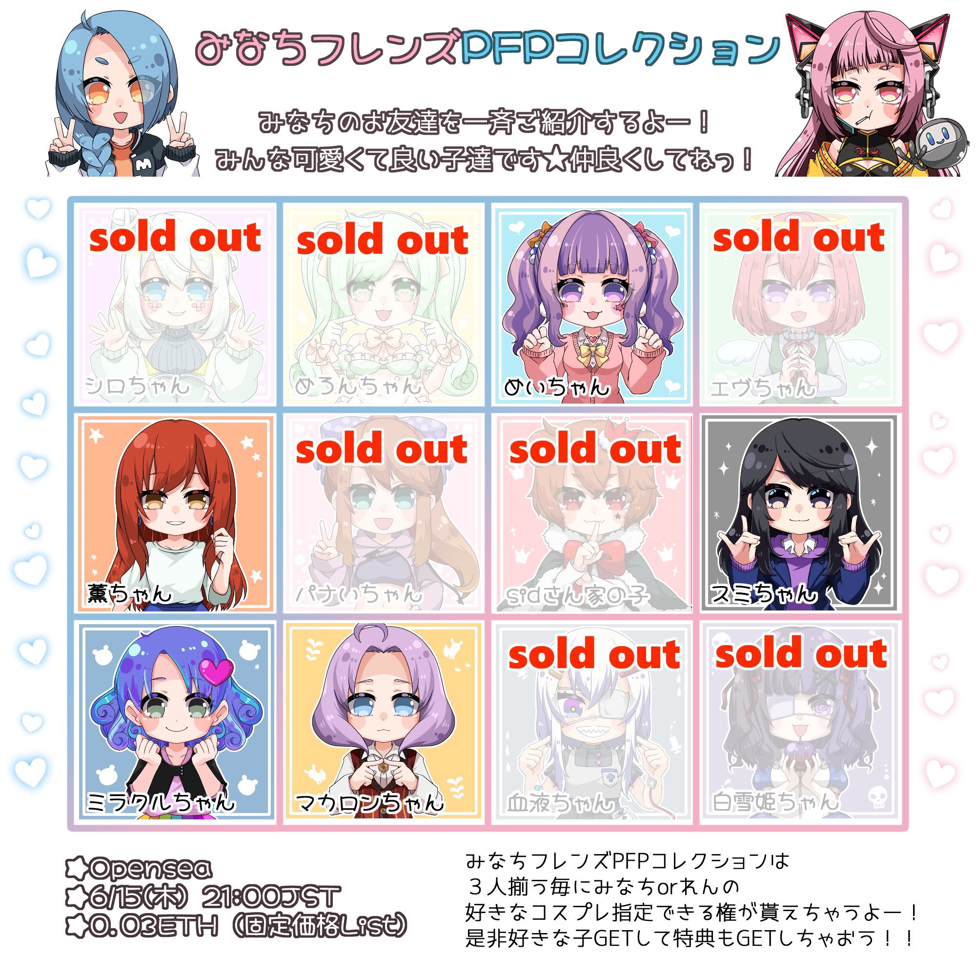久しぶりに宣伝どーん🩷 みなちフレンズPFPコレクション! 現在5人のフレンズがお迎えを待ってます🤭✨ アイコン映えはもちろん集めても可愛いちびちゃん達です🥰 是非お迎えお待ちしてます🙏✨ 💰0