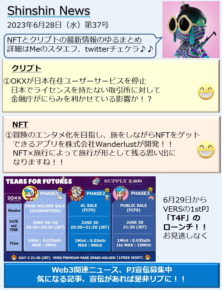 Shinshin News 20230627 注目ニュースはVERS 1stPJのローンチが29日から開始です。田中さんの魂こもった作品たちを手に入れるチャンスです!!ぜひこの機会に!! #VERS