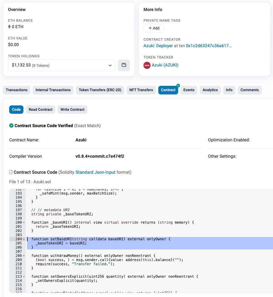 99% 买了 Azuki NFT 的人,甚至没有上过 etherscan 去查看他们的合约源代码。 写的很清楚,setBaseURI这个函数,有个onlyOwner的modifier,项目方可以随时随地换掉你的破图。 再一次证明了币圈投机客99%都是傻逼、弱智、文盲、三低人士,连etherscan都不会用,就在那儿炒一个个空气。 真的活该嗷。