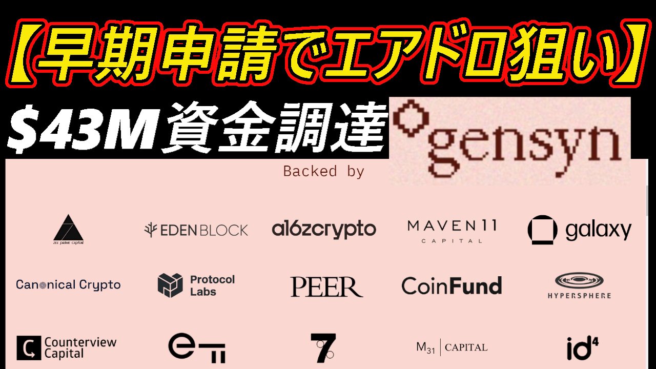 #airdrop #エアドロ 本日は #gensyn の早期登録のご案内🦍🍌VCが強いし、資金調達も$43Mしております! アリスNFTも21時より発売なのでALもっている人は忘れずに👀 皆様リツイート宜しくお願い致します😊 【本日の動画はこちら】 https://t