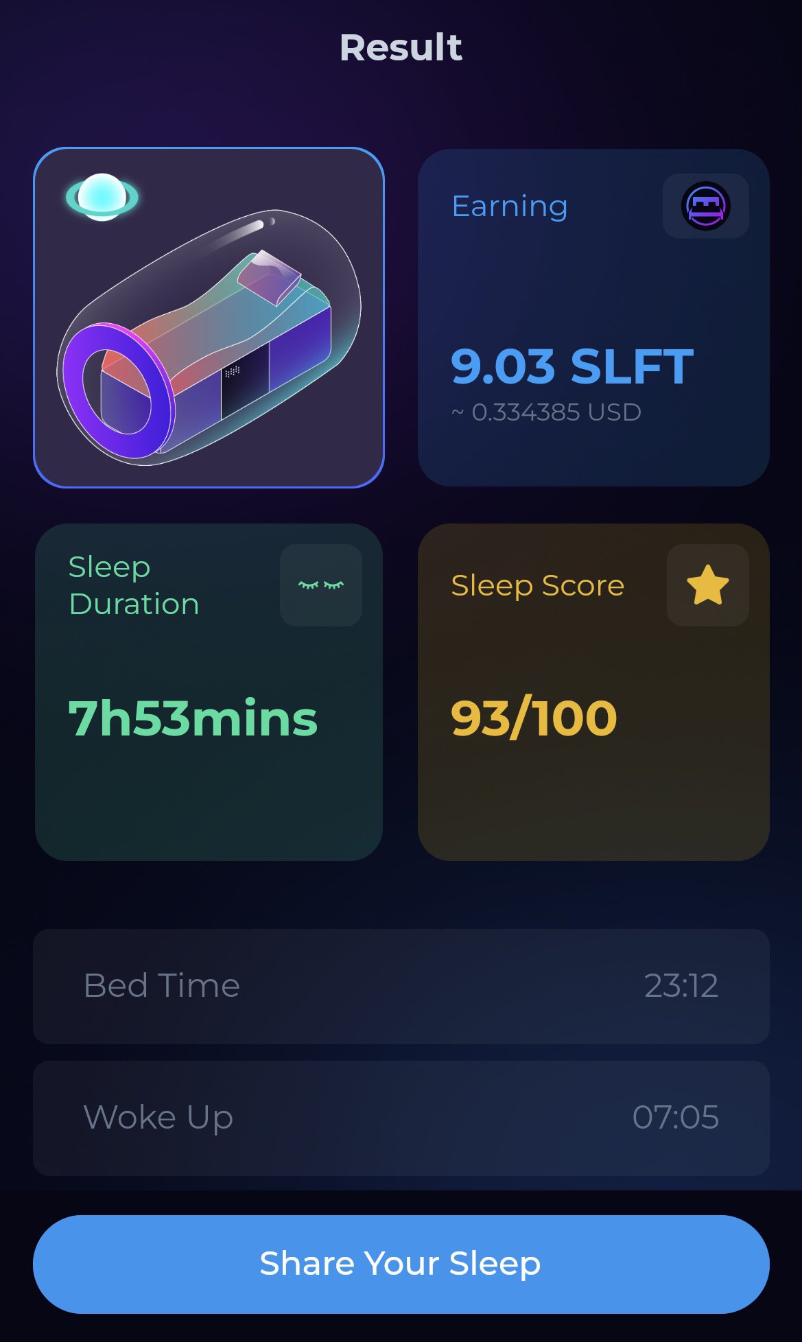 久々の #SleeFi 🛏️💤 スコアは上々です! 本番でもフレキシブルベッド欲しいなぁ #SleepToEarn #Openβ #NFT ※映っちゃいけないモノが映っちゃったので再ポストです🫣